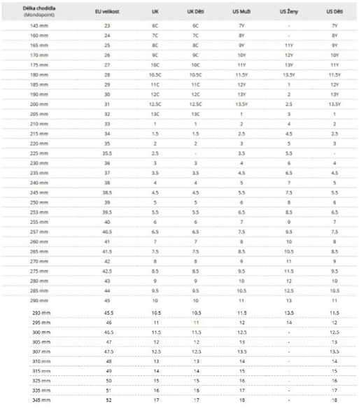 Kotva tabulky velikostí